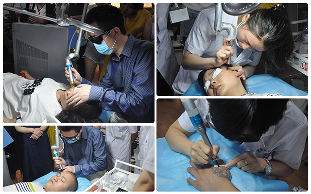 为了更好的向与会者展示以色列宝石之光的卓越性能,除了丰富的理论知识讲解外,昆大也应邀了4名包括黄褐斑、晒斑、纹身、痣等在内的色素性皮肤问题顾客进行了案例实操。活动现场采取“3+1”的直播模式,即在治疗室内“专家实操+专人调参+主持人提问”,同时在过程中专家即时讲述患者情况与治疗方案,这让与会者能最大化的身临其境的观摩和学习,得到实实在在的提升。