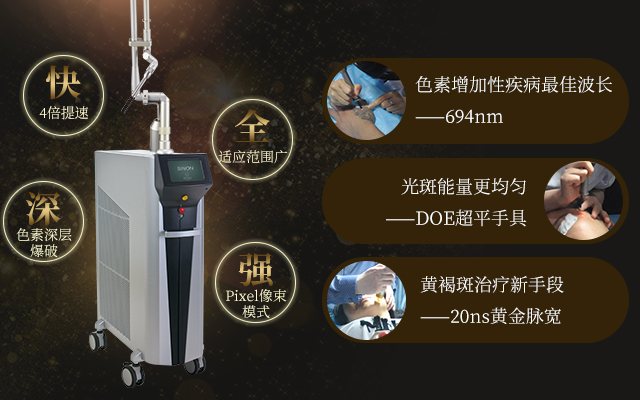 以色列第三代红宝石激光突破传统是Alma LasersTM的明星产品,是目前国际上较为全面的解决色素性皮肤问题的调Q激光技术,经过医生们的临床研究与实践操作,更是惊讶地发现宝石之光的的治疗效果好到连医生都难以置信!可解决超过90%的色素性皮肤问题,有“色素性皮肤治疗金标准”的美称。